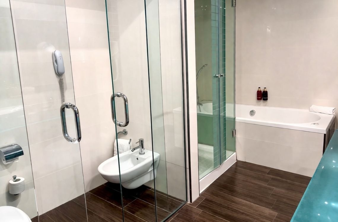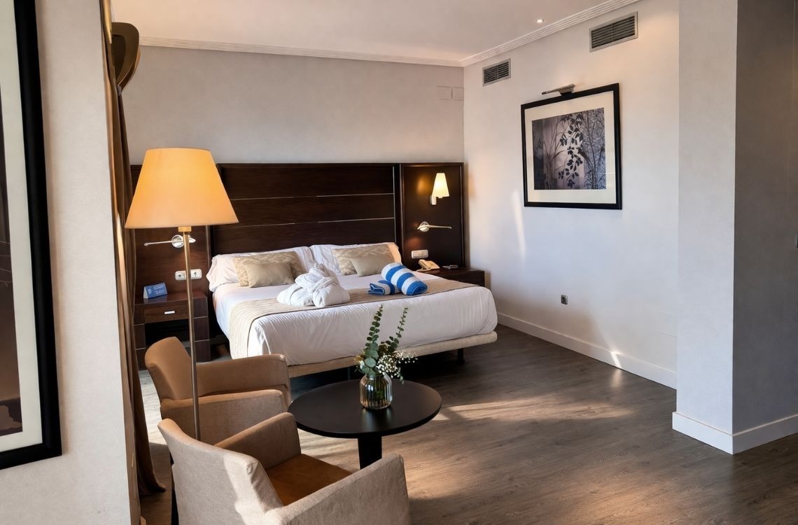 Habitación doble Élite equipada con WiFi Gratuito, aire acondicionado y calefacción central con termostato individual, teléfono directo, televisión vía satélite, cafetera de cápsulas, hervidor de agua, mini bar, caja fuerte, conexión a internet y baño completo con secador de pelo. Todas nuestras habitaciones disponen de terraza.