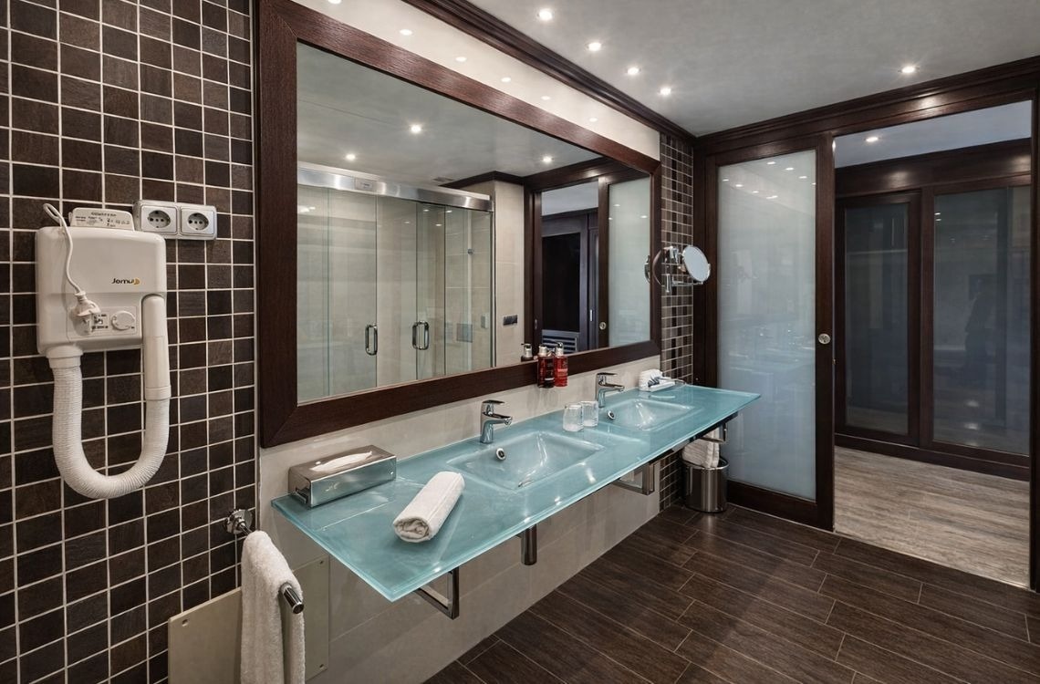 Suite equipada con WiFi Gratuito, aire acondicionado y calefacción central con termostato individual, teléfono directo, televisión vía satélite, cafetera de cápsulas, hervidor de agua, mini bar, caja fuerte, conexión a internet y baño completo con secador de pelo. Todas nuestras habitaciones disponen de terraza.